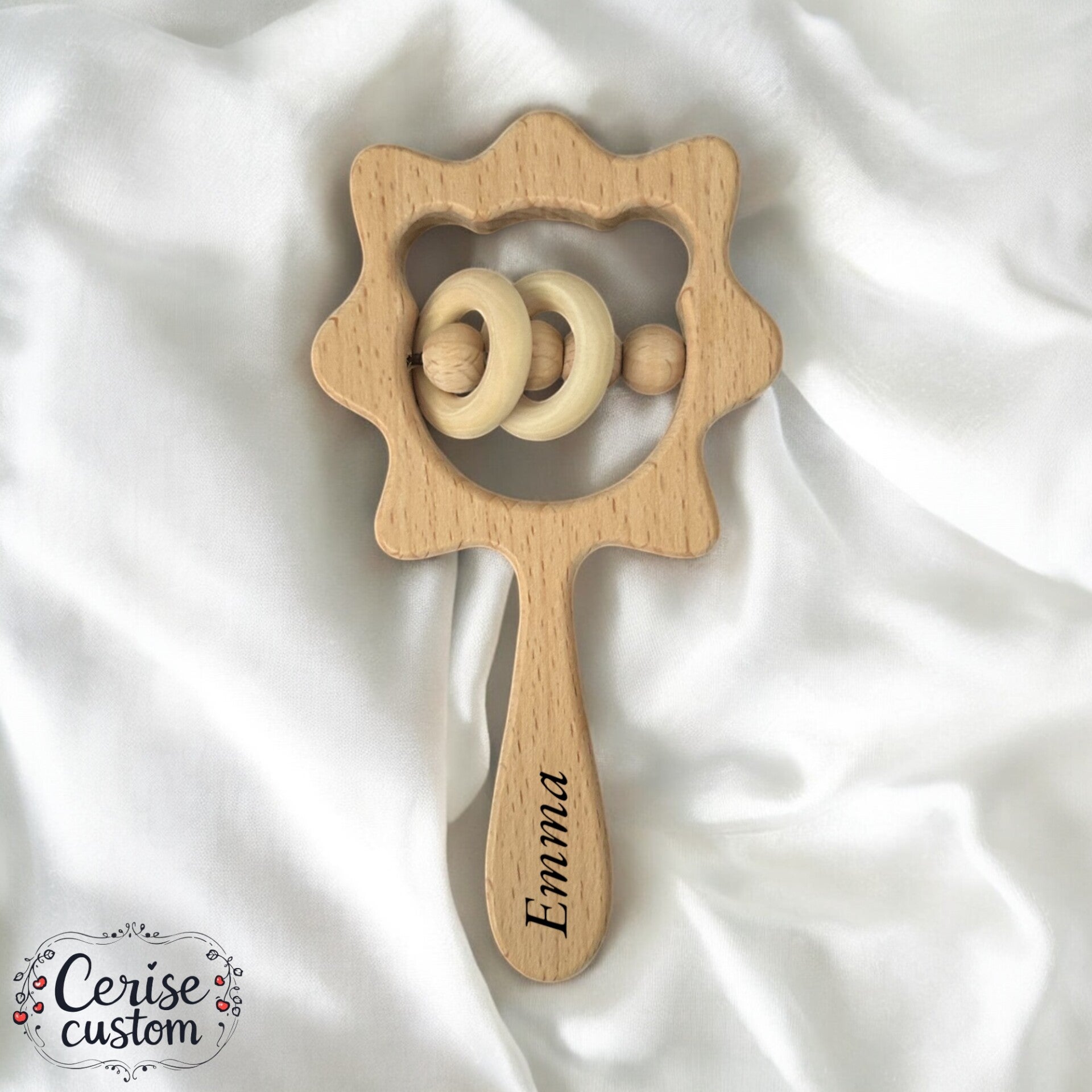 Petit hochet en bois naturel, parfait pour les premières explorations sensorielles de bébé.